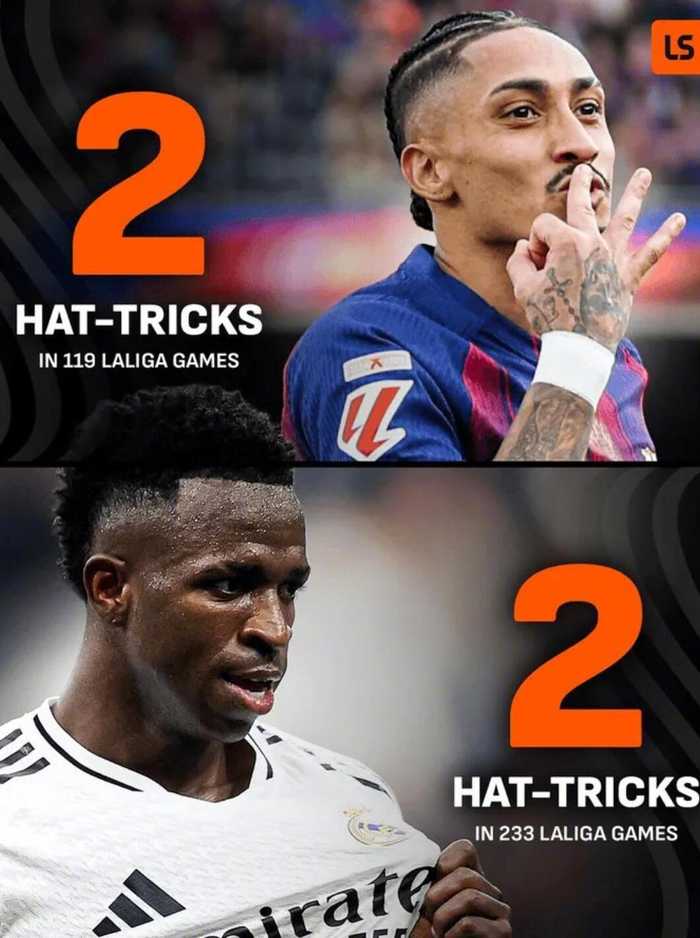 根据LiveScore的统计,拉菲尼亚和维尼修斯在西甲联赛里都上演过两次帽子戏法,但是拉菲尼亚比维尼修斯少踢了114场比赛。